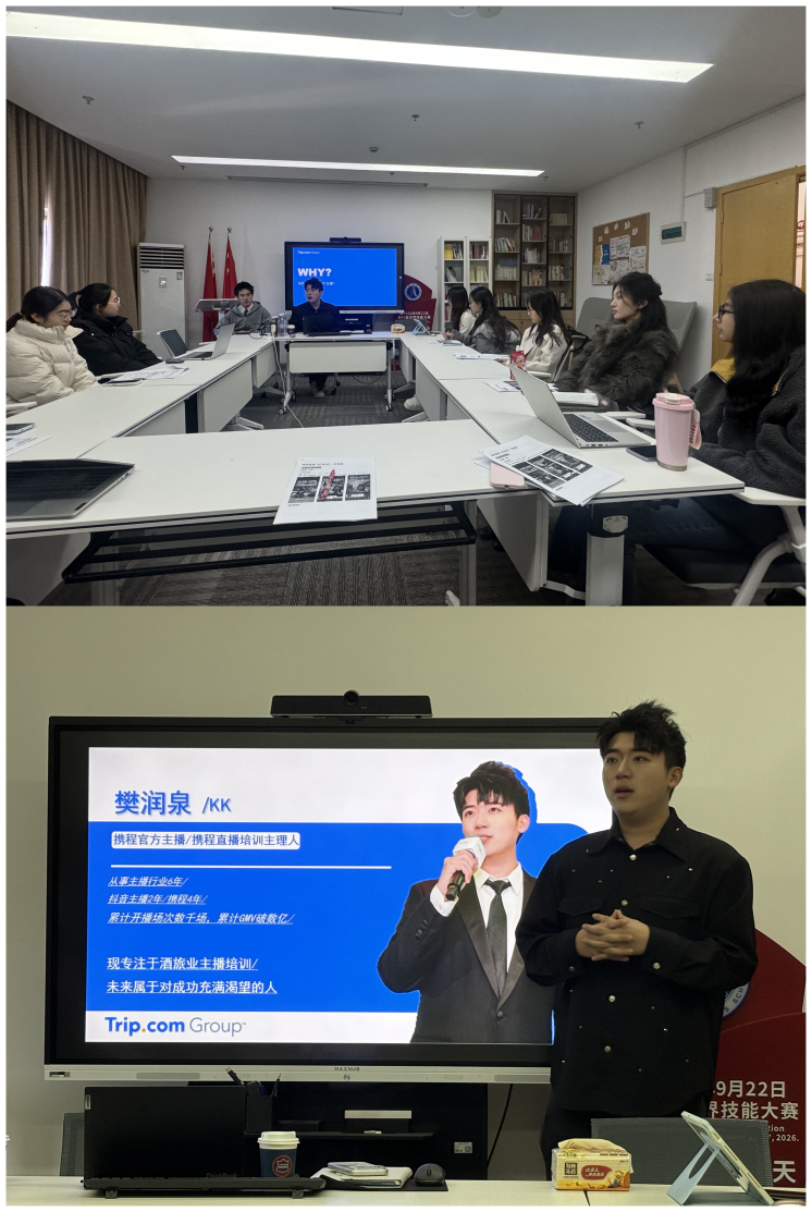 继酒店管理学院与携程旅游学院共建项目首批启动仪式圆满举行后,为加速推进“懂文旅、善运营、会直播”复合型人才培养目标,1月14日,携程直播专项培训在我校奉浦校区综合楼F415会议室正式开课。作为校企共建项目落地的关键环节,本次专项培训特邀携程官方主播、直播培训主理人樊润泉担任主讲人。酒店管理学院院长姜红,旅游管理专业教师李思志及辅导员段耀婷、张泾泾全程参与,构建起“校企协同+师生联动”的培训保障机制,为培训高效开展和学院微专业、创新班建设筑牢坚实基础。