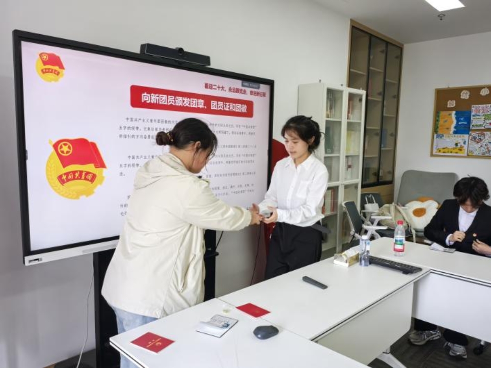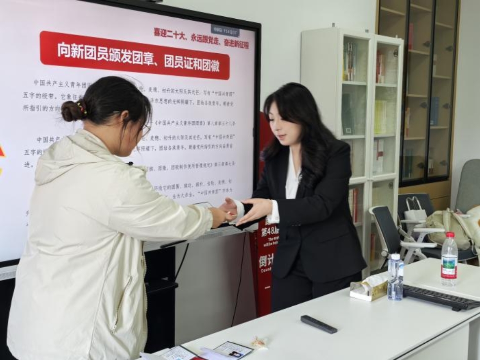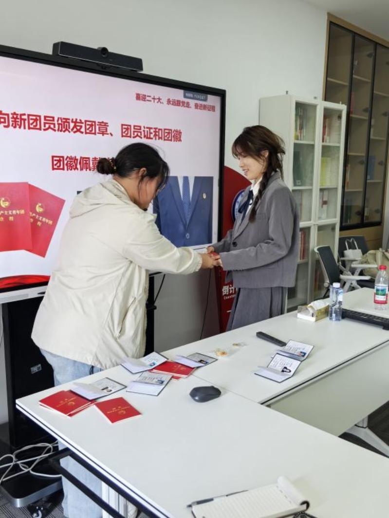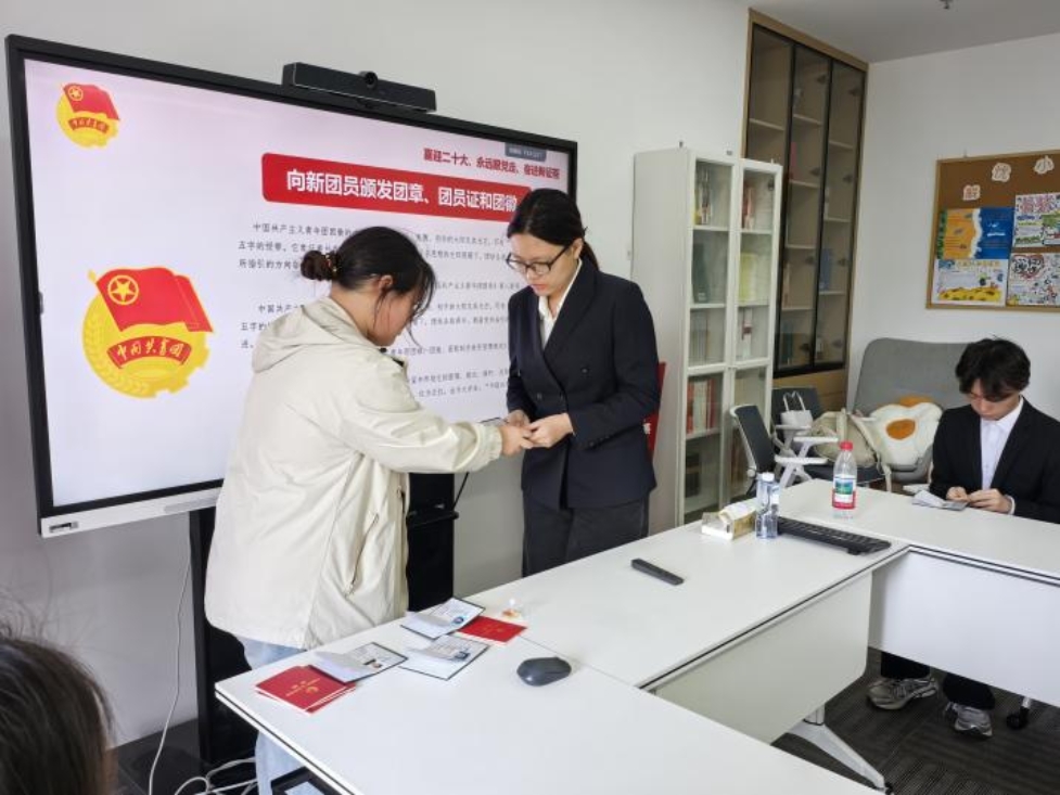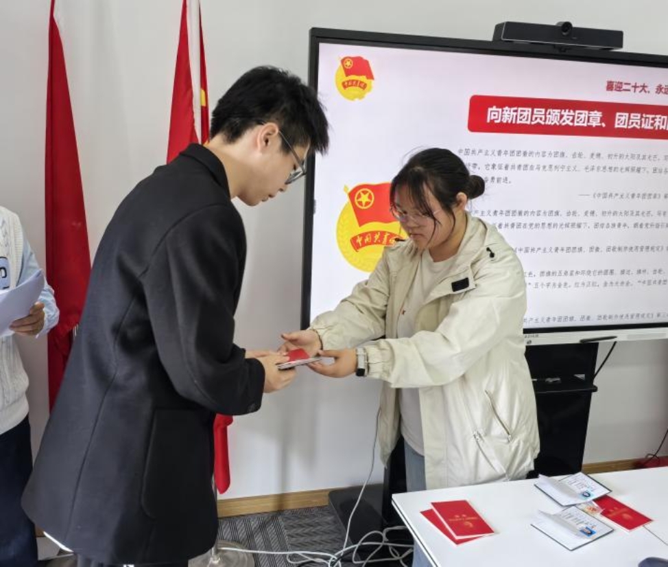 优秀团员代表余洋向新团员颁发团章、团员证和团徽