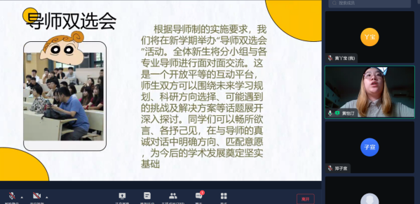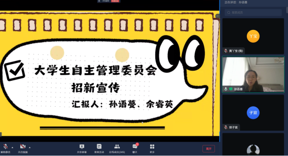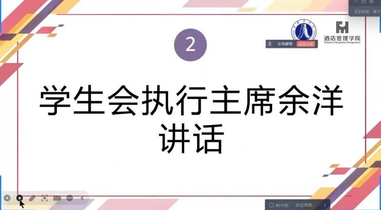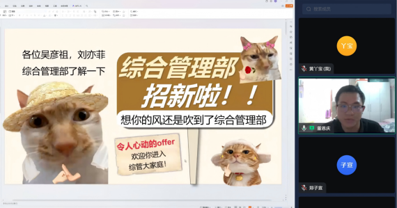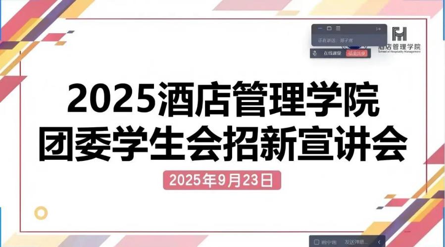金秋九月纳新颜,酒管学子正当时。随着新学期的到来,酒店管理学院团委办公室悉心筹划,于2025年9月23日在线上顺利召开酒店管理学院团委学生会招新宣讲会。酒店管理学院团委书记张泾泾老师、团委学生兼职副书记韩静蕾、学生会执行主席余洋、学生会轮值主席叶奕晨、学生会主席团成员丁小裕出席会议,团委学生会各部门负责人及全体2025级新生参加会议,会议由办公室副部长郑子宣主持。