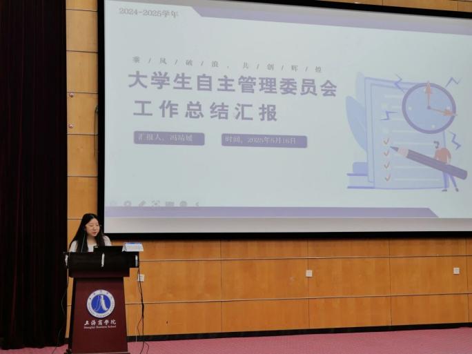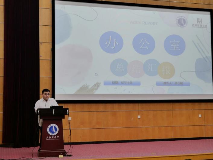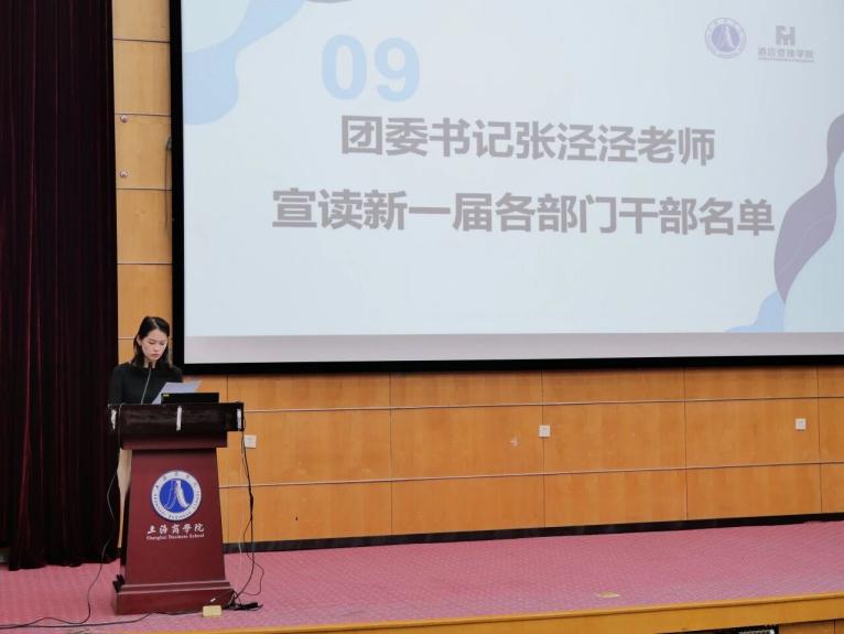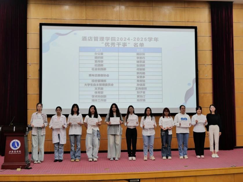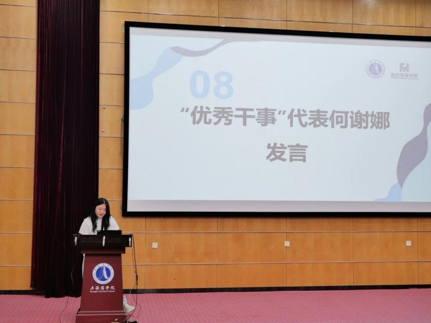 为持续深化酒店管理学院团委学生会组织建设,总结经验成果,表彰优秀成员,从而更高效地服务学院师生,上海商学院酒店管理学院2024-2025学年团委学生会总结大会于2025年5月16日在2号楼130报告厅隆重举行。酒店管理学院团委书记张泾泾老师、第十届团委学生兼职副书记屈天姿、学生会执行主席张琬若、学生会轮值主席孙雅鈮、主席团成员张若怡及全体团学成员共同参会,大会由团委办公室韩静蕾主持。