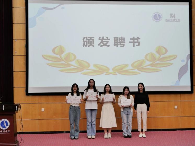 在本次团委学生会总结大会上,颁发聘书环节意义非凡。团委书记张泾泾老师亲自为第十届团委学生会部门干部们颁发了聘书,团学干部们在任期内,兢兢业业,他们的身影活跃在学院的各个角落,为学院活动开展、学生服务等方面付出诸多努力。张老师向他们表示衷心感谢,称赞其凭借不懈努力与炽热情怀,有力推动学院学生工作稳步前行。