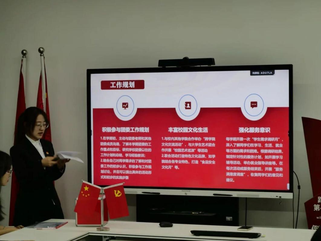 在第一轮面试中,各部门候选人依次上台进行述职答辩,他们分别结合个人经历、部门参与的工作、对部门工作的想法以及未来期望等方面展开阐述。答辩完毕,主席团及部门干部对候选人进行提问,部门干事举手表决。第一轮面试结束后,经团委书记和主席团商议,对候选人进行初步筛选。