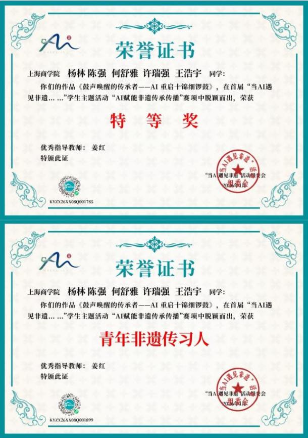 由我院姜红教授、邴振华副教授、徐薛艳副教授指导,我院2024级研究生杨林同学领衔的团队(成员:陈强、何舒雅、许瑞强、王浩宇),以《鼓声唤醒的传承者:AI重启十锦细锣鼓》非遗传承参赛项目,从全国众多优秀作品中脱颖而出,一举夺得全国特等奖,团队成员同时获评该赛事“青年非遗传习人”称号。此外,我院另外2支参赛队伍表现同样亮眼:由叶奕晨担任队长、余洋、王嘉艺、刘奕恒组成团队的作品《沪数新生》以及由王倪佳担任队长、肖若涵、吴卓妍、徐萩琪、李怡乐组成团队的作品《当AI遇上老上海非遗——“兰楫申韵”旅游数字藏品设计》斩获全国三等奖。