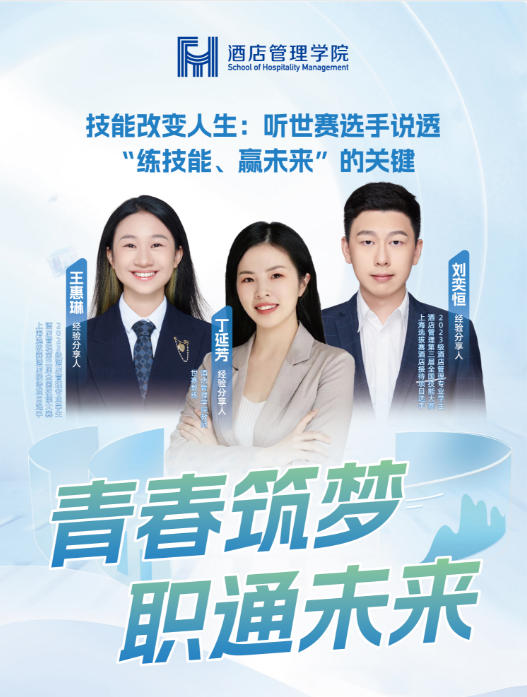 近日,青春筑梦职通未来酒店管理学院直播专场《技能改变人生:听世赛选手说透“练技能、赢未来”的关键》主题直播顺利举办,主持人余睿英采访了两位第三届全国技能大赛上海选拔赛(世赛选拔项目)酒店接待项目的获奖选手——酒店管理231班王惠琳、酒店管理232班刘奕恒,以及上海商学院世赛教练团队丁延芳老师,聆听他们的亲身经历,拆解“从技能训练到职业成长”的核心逻辑。与此同时,丁教练也分享了技能大赛的内涵、考核标准与学生的参赛路径,为有志于技能提升的学生提供了全方位指引。
