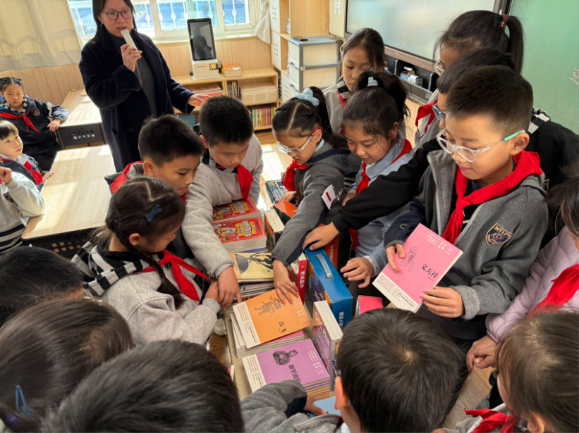 活动现场,酒店管理学院师生一起将150册精心挑选的图书交给孩子们。这些图书包括《中华上下五千年》《中国古典四大名著》等传承文化根脉的经典读物,《中国儿童数学百科全书》《儿童动物百科全书》等普及科学知识的趣味书籍,以及《爱丽丝漫游奇遇记》《木偶奇遇记》等国际大奖小说,《中外名人传记少年版》《了不起的中国》《小学英语绘本故事》《迪士尼心理成长双语套装》等兼顾成长励志与心理培育的特色书籍。图书刚一亮相,就吸引了小学生们的目光。孩子们小心翼翼地拿起心仪的图书翻阅,纷纷围着新书交流讨论,现场洋溢着欢乐温馨的氛围。