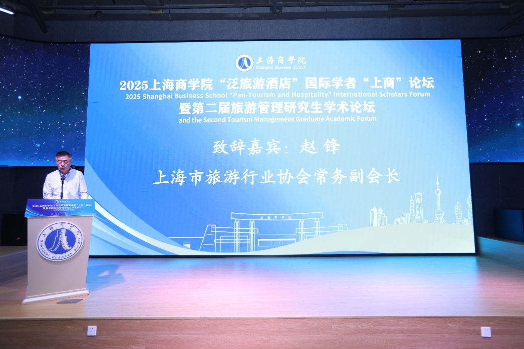论坛开幕环节,上海市旅游行业协会常务副会长赵锋致辞。他祝贺论坛召开,并指出文旅产业作为“幸福产业”,对服务美好生活、推动经济高质量发展至关重要。他强调,产业繁荣亟需高素质人才支撑,并充分肯定了我校酒店管理学院MTA项目紧密对接上海“五个中心”与“四大品牌”建设,在培养泛旅游酒店业应用型管理人才及构建产教研学融合机制方面取得的成效。