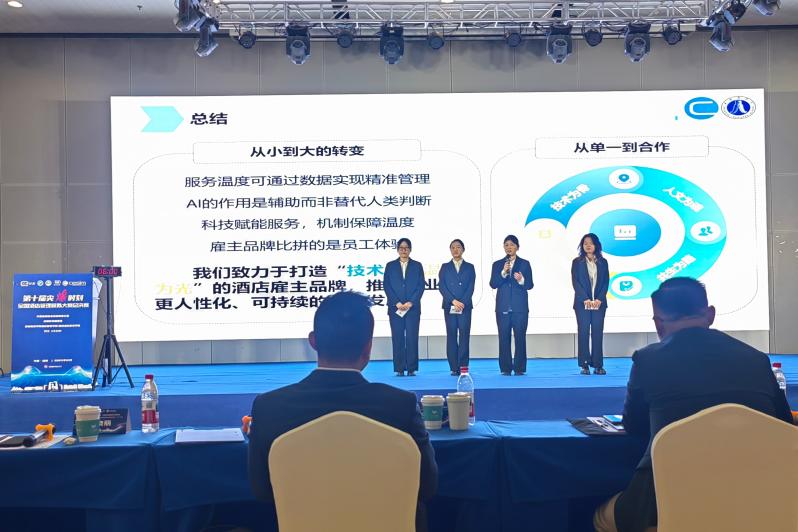 在全英文展示环节中,团队凭借节奏鲜明的语言表达和默契得体的团体协作等方面赢得好评。在商业展示环节中,团队围绕“数据驱动、策略引领、可持续发展”核心要求,行业真实数据为支撑,“暖域重塑、感触演算”为主题,以酒店收益管理优化、酒店客房与餐饮产品创新、酒店员工激励,融入跨文化沟通能力,通过敏锐的行业洞察、具体可行的创新方案获得评委一致认可。