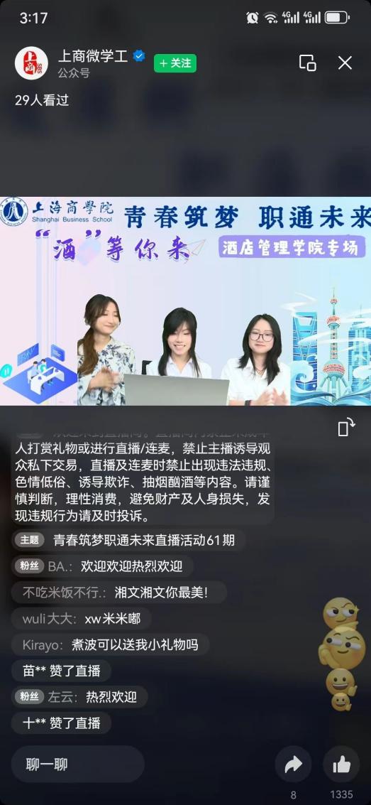 2025年5月27日15:00,由上海商学院就业创业指导服务中心与酒店管理学院联合主办的“青春筑梦 职通未来”第六十一期专场直播顺利开播。本场直播聚焦食品质量与安全专业,邀请到柏缘媛、杜湘文两位优秀毕业生学姐,围绕考研备考、职场适应、专业学习等热点话题展开分享,吸引百名师生及家长在线参与互动。