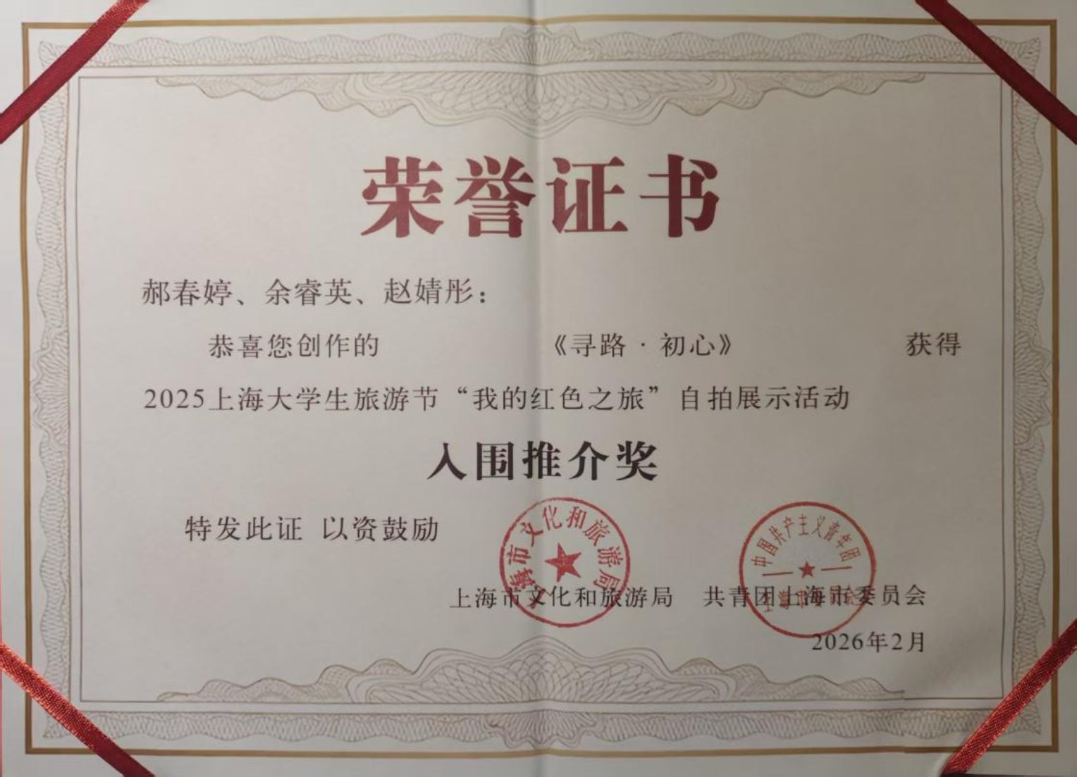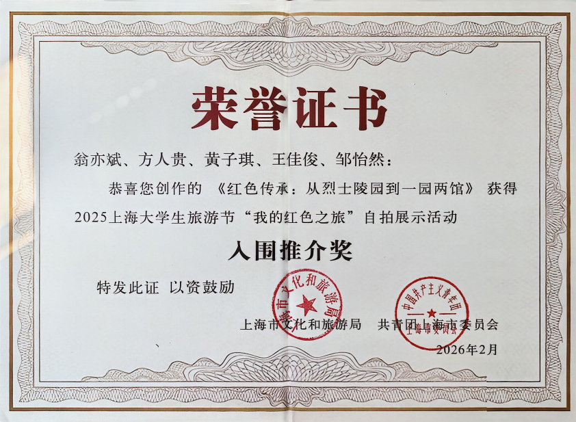 近日,由上海市文化和旅游局、共青团上海市委员会共同举办2025上海大学生旅游节“我的红色之旅”自拍展示活动圆满落下帷幕。上海商学院酒店管理学院旅游管理专业学生郝春婷团队和学生翁亦斌团队积极响应校团委、院团委的号召参与活动,以双脚丈量土地,以扎实的专业功底创作宣传作品《寻路·初心》与《红色传承:从烈士陵园到一院两馆》,荣获两项市级入围推介奖荣誉。