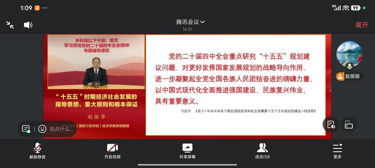 在学习党的二十届四中全会相关精神环节,党支部书记赵丽丽以《学习贯彻党的二十届四中全会精神培训》总体介绍此次政治学习的重要意义和具体要求。之后,党员老师在线学习观看由中央党校(国家行政学院)经济学教研部赵振华教授主讲《乡科级以下干部、党员学习贯彻党的二十届四中全会精神专题辅导课程》之《“十五五”时期经济社会发展的指导思想、重大原则和根本保证》视频,主要包括制定“十五五”规划的重要意义和《建议》的基本结构、“十五五”时期是基本实现社会主义现代化的关键时期、“十五五”时期经济社会发展的指导方针和主要目标等内容。各位党员老师认真学习聆听,并随后交流发言。王松茂教授把党的二十届四中全会精神、国家战略与科研工作结合起来,如促进消费共同富裕、乡村振兴、防止返贫等具体科研着力点,史文天老师结合中国入境旅游便利度与国际化水平提升、支付便利化、旅游形象推广以及具体专业实习工作等方面谈了学习体会,钟伟老师则主要结合酒店管理行业转型与专业建设等特点,重点交流落实党的二十届四中全会精神的具体做法,如利用AI技术赋能课堂建设等,卢道典老师也结合“两会”中人大代表、政协委员的文旅相关提案、建议,交流了科技赋能旅游强国建设的学习体会。
