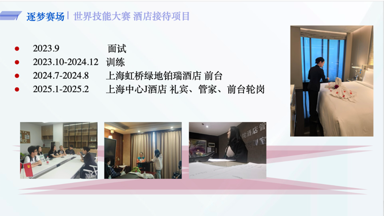 酒店管理231班罗米佳以“红色领航+竞赛赋能”为主题分享个人成长路径。她从入学初期便递交入党申请书,经过入党积极分子培训、青马工程培训、发展对象培训等关键环节,最终成为中共预备党员。她始终以高标准严格要求自己,投入一年多时间备战世界技能大赛酒店接待项目,利用寒暑假在酒店开展前台、礼宾等岗位实训,将服务细节练至极致,最终斩获上海市选拔赛铜牌。