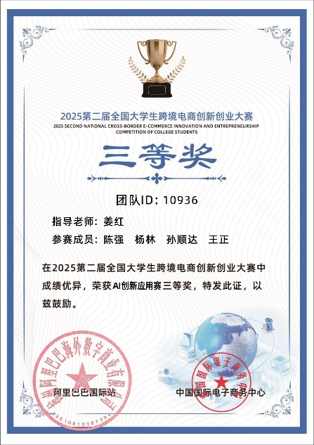 近日,第二届全国大学生跨境电商创新创业大赛总决赛落幕,酒店管理学院学子在本次AI创新应用赛赛道中表现优异,斩获全国三等奖。该比赛由商务部中国国际电子商务中心主办,联合阿里国际站等行业头部企业及高校共同打造,自2024年启动以来,已覆盖全国百余所高校,吸引千支队伍参与,是国内跨境电商领域规模最大、实战性最强的赛事之一。