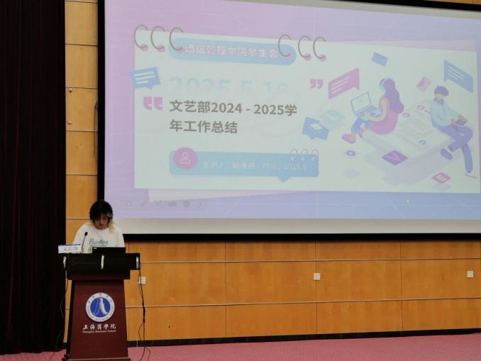 学生会执行主席张琬若对学生会部门进行总结发言,张琬若在发言中表示:“酒店管理学院学生会始终秉持‘服务同学、锻炼自我’的宗旨,在传承中创新,在挑战中突破。”她指出,要提升成员综合素质与服务能力,进一步发挥学生会的桥梁纽带作用,助力营造积极向上的校园氛围。